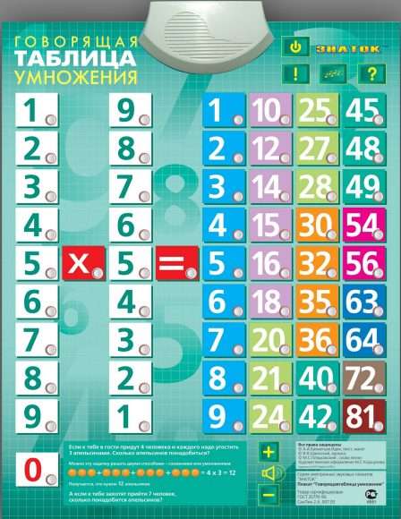 Говорящая таблица умножения сама расскажет ученику, как ею пользоваться: как включить и выключить, как "попросить" ее решить пример, какую кнопку нужно нажать для сдачи экзамена. Материал на электронном плакате представлен с учетом удобства восприятия. Принцип работы такой же, как у калькулятора. Говорящая таблица умножения озвучивает производимое действие и оглашает его результат. Если малыш захочет передохнуть и отвлечься - можно нажать на кнопку "Веселая песенка", и тогда говорящая таблица умножения споет для него.