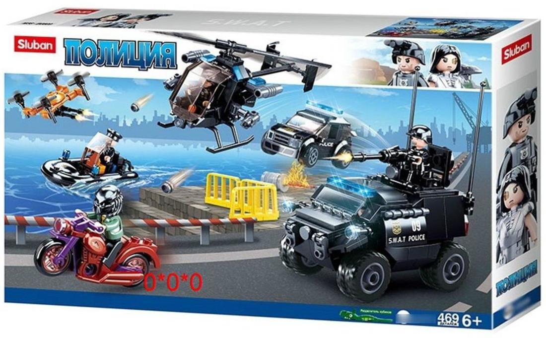 В комплекте: 469 деталей для сборки 2-х полицейских машин длиной 11 см и 11,2 см, 1-й лодки длиной 11,1 см, вертолёта длиной 19,3 см и 5-ти фигурок человечков, а также 1 иллюстрированная инструкция.