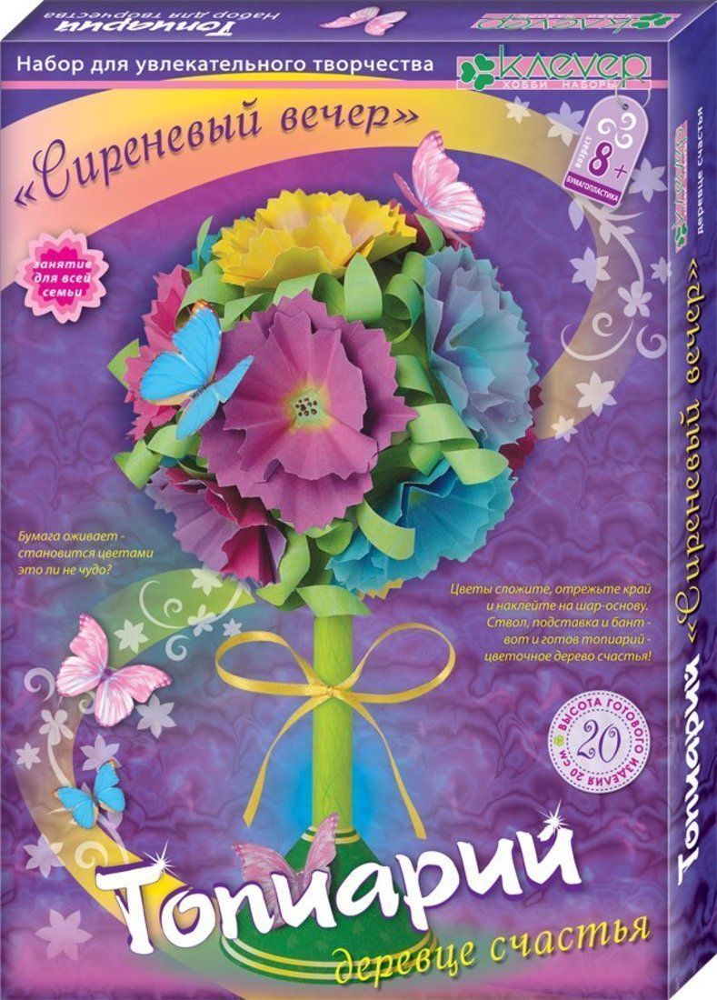 Топиарий - деревце, приносящее счастье, - абсолютно новый продукт на рынке творчества.Сделать Топиарий несложно: собирается картонная основа для кроны из готовой детали, в угол кроны вставляется склеенный ствол с опорой-подставкой. Затем крона украшается цветами, бабочками и листиками-завитками, а ствол - яркой атласной лентой, - и волшебное деревце готово! Совместное создание Топиария станет увлекательным занятием для ребёнка старше 8 лет и его близких. Декоративное деревце, созданное в техниках «бумагопластики» и «киригамии», словно из волшебного сада, появится в доме и будет украшать его круглый год!