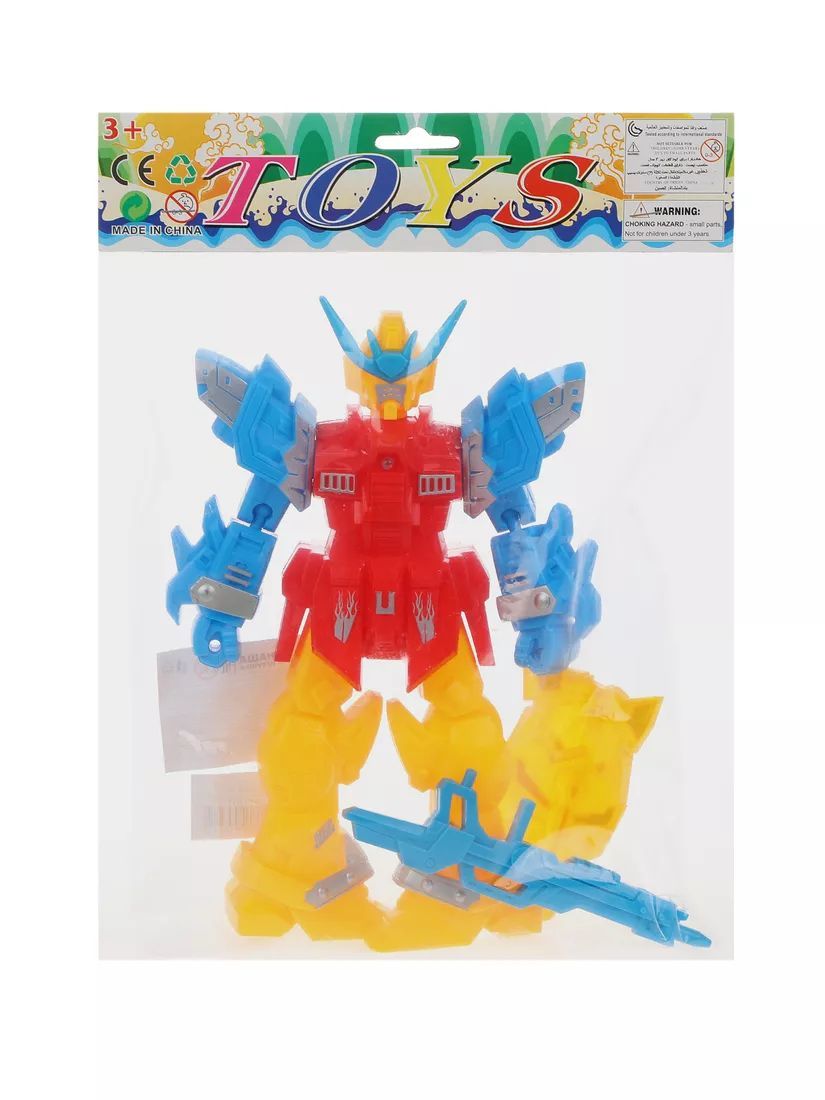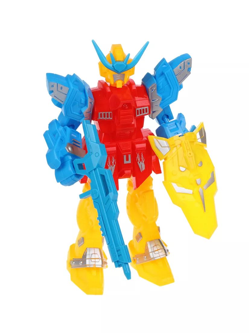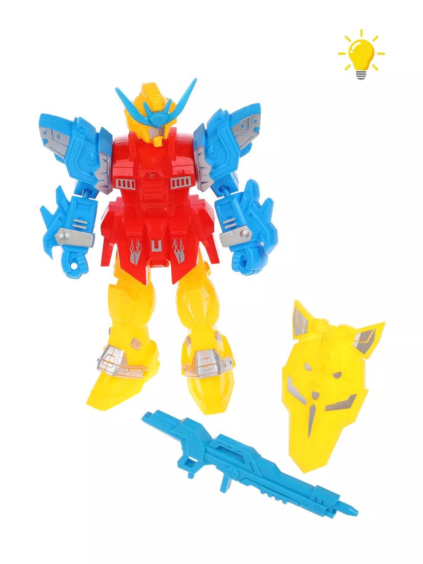 Робот с подсветкой обладает подвижными частями тела. Для того, чтобы загорелась лампочка, нужно нажать кнопку на спине у робота. В комплекте прилагаются аксессуары: автомат и щит.