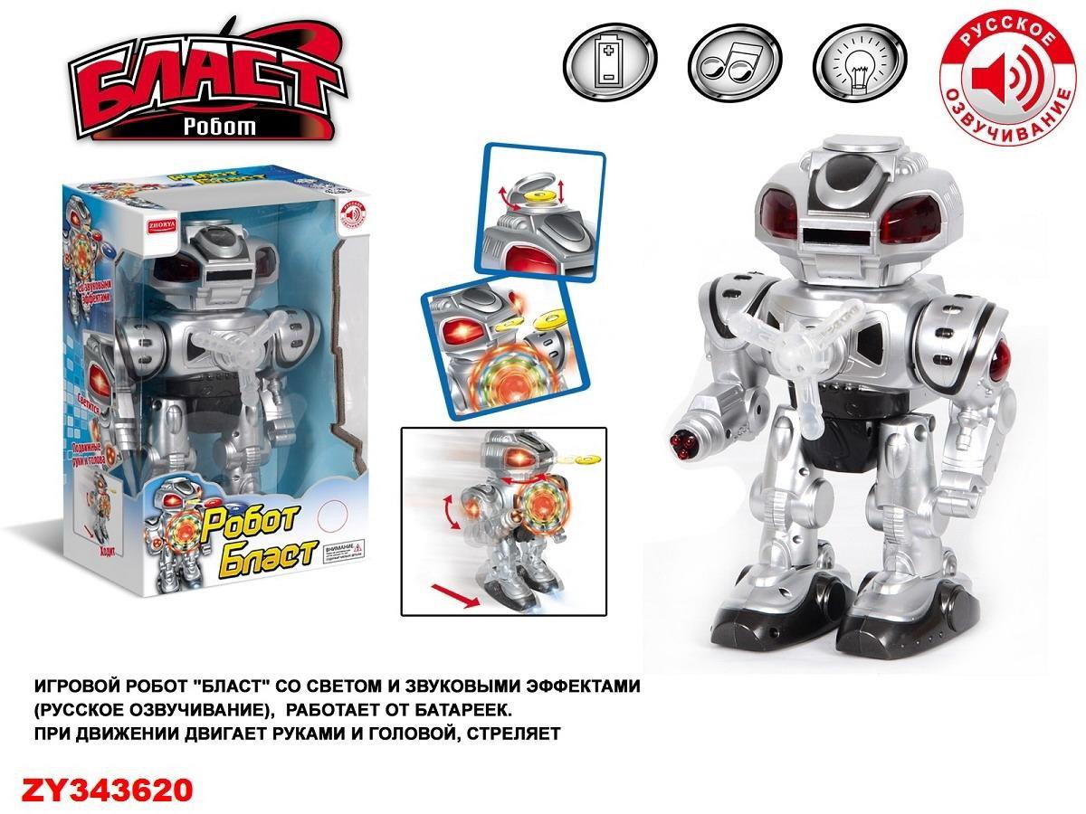 Робот Бласт станет отличным подарком для любого мальчика. Он имеет необычный инопланетный дизайн, светящиеся красным светом глаза, вращающийся пропеллер. На его голове есть специальный отсек для дисков, которыми он забавно стреляет. Робот умеет ходить, его руки и голова также подвижны, он произносит фразы на русском языке.