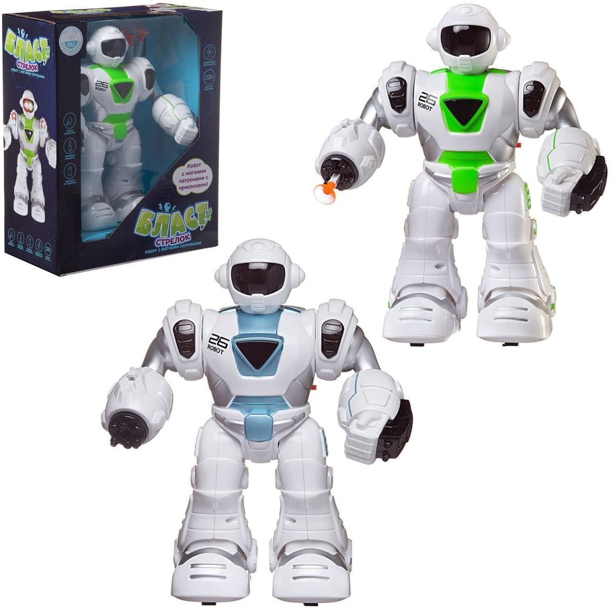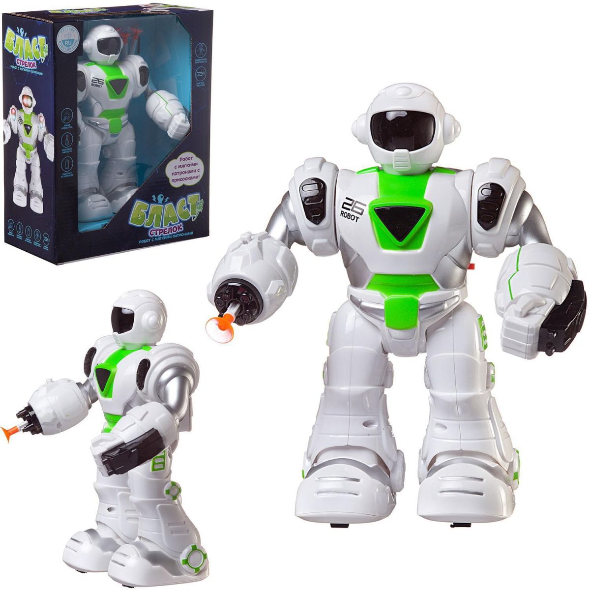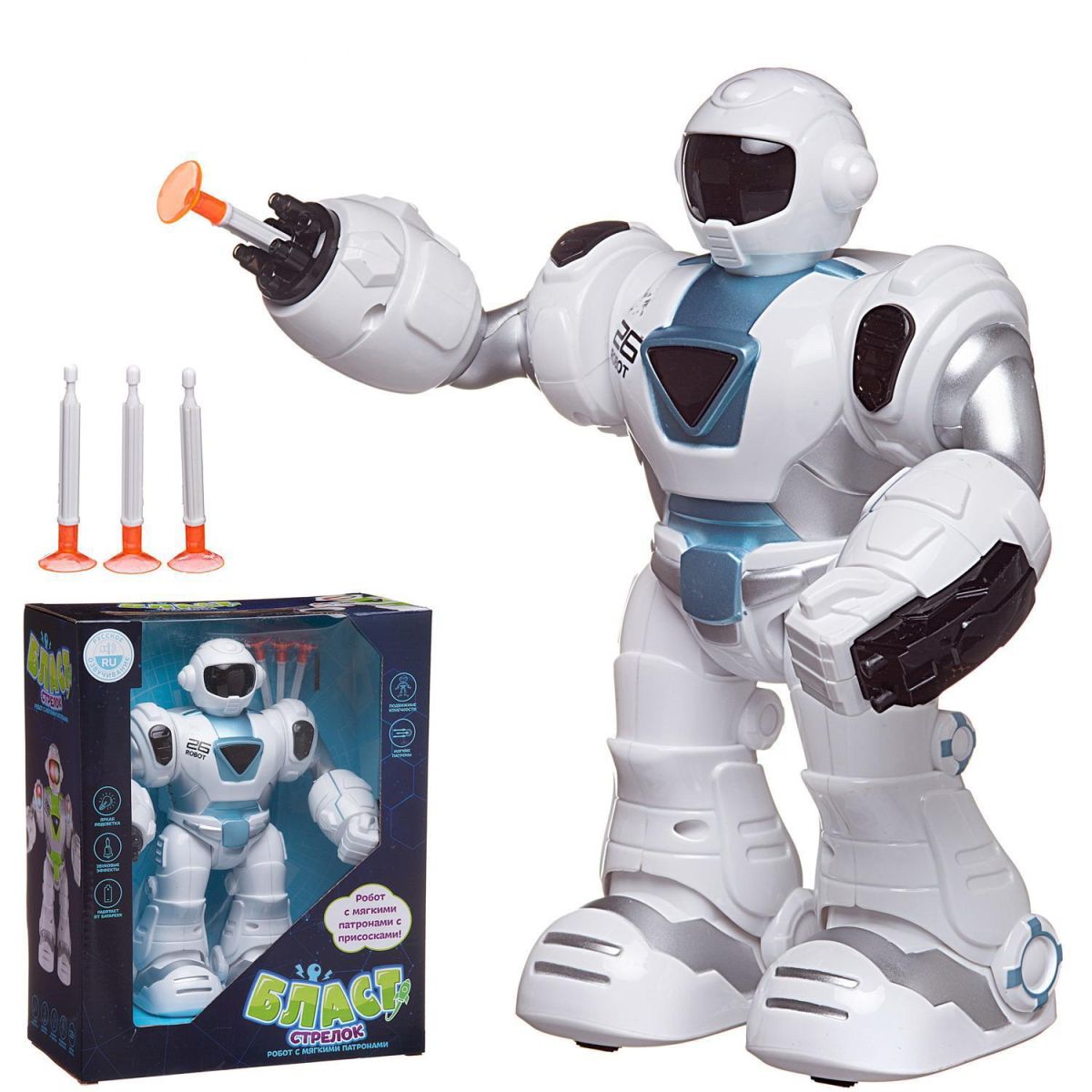 Робот "Стрелок" из серии Бласт станет отличным подарком для любого мальчика. Он имеет реалистичный дизайн, яркую подсветку. Робот умеет ходить, его руки и ноги подвижны. В правую руку робота встроена пусковая установка, которая стреляет безопасными стрелами с наконечниками в виде присосок, входящими в комплект набора. Чтобы запустить стрелу, нужно нажать на кнопку на правой руке. Робот произносит фразы на русском языке.