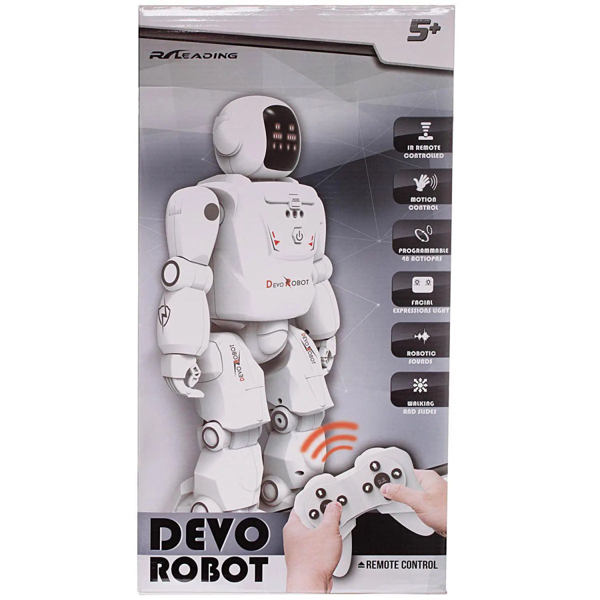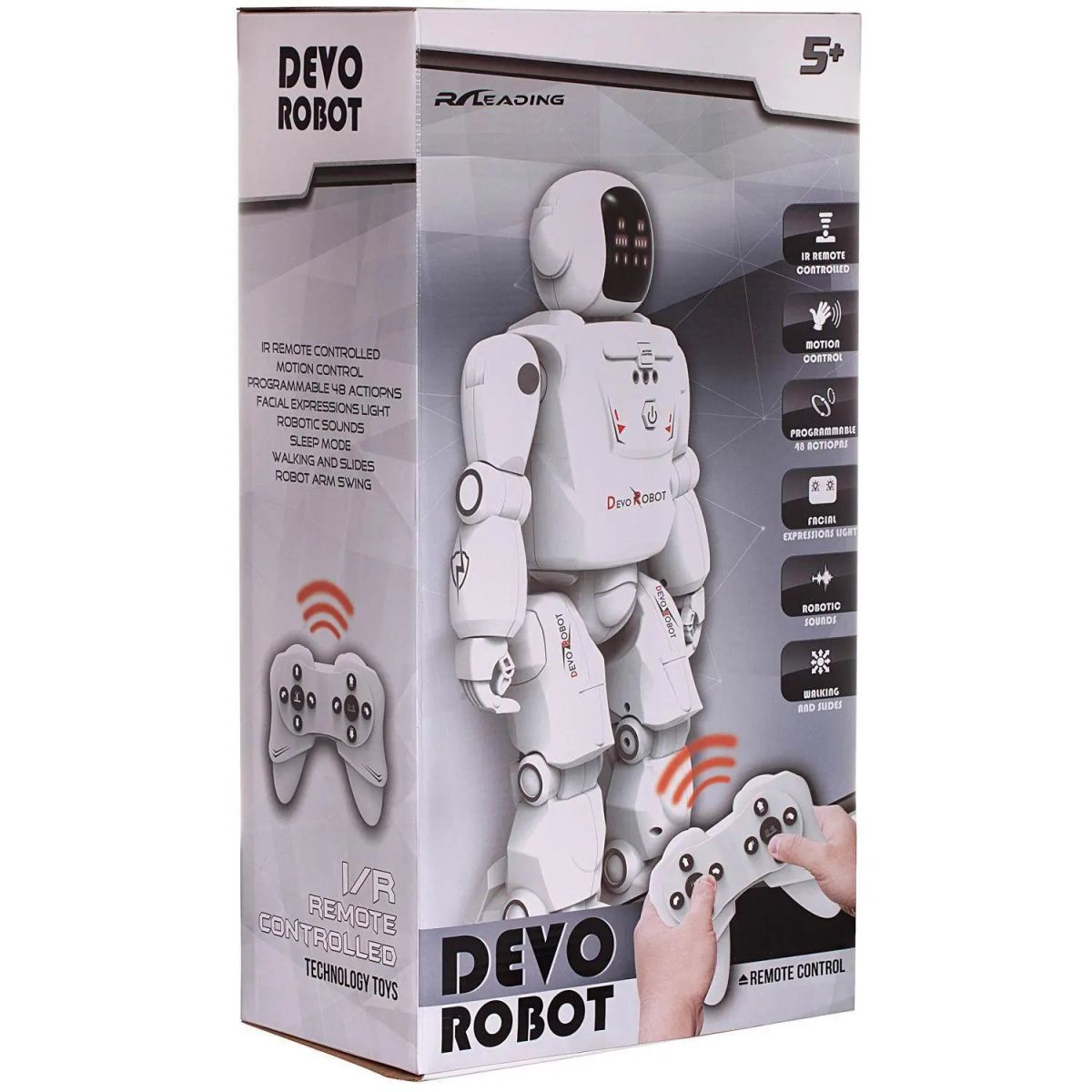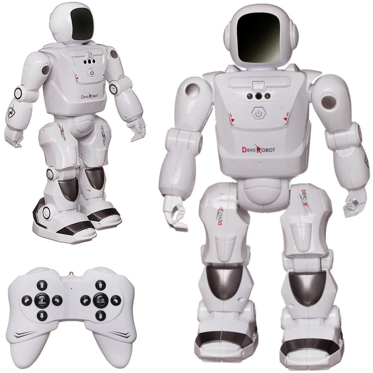 DEVO ROBOT от бренда Junfa - отличный интеллектуальный радиоуправляемый робот, с реалистичным внешним видом и отличными характеристиками. Им можно управлять с помощью пульта дистанционного управления или просто используя одну руку. Робот поддерживает функцию программирования до 48 действий с помощью простых действий. Внутри головы встроена светодиодная подсветка, доступны несколько различных выражений лица. Благодаря всем этим удивительным функциям робот будет отличным подарком любому ребенку.
