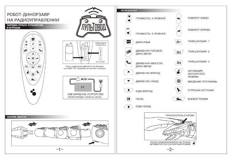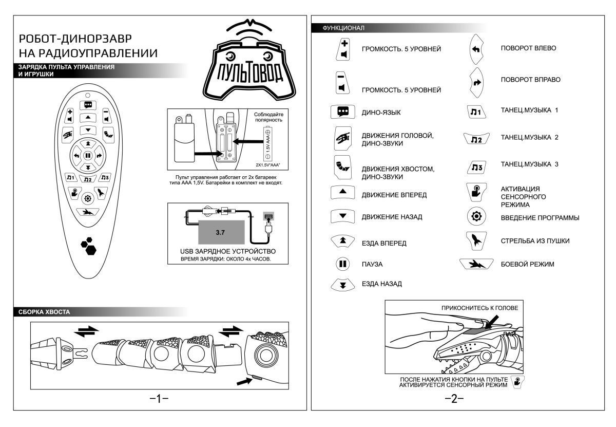 Для работы робота-динозавра требуется аккумулятор 3.7 V (в комплекте),
