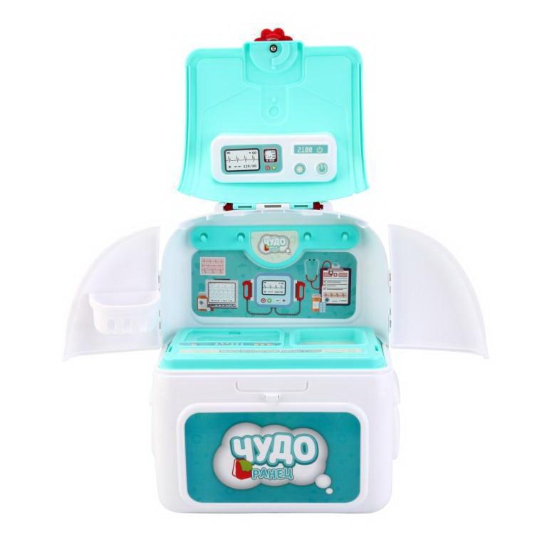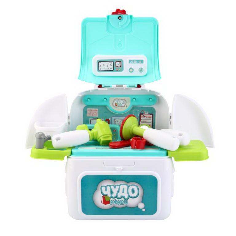 Комплектация набора: ранец пластиковый - 1 шт, ремень текстильный для переноски ранца на спине- 1 шт, навесная полка - 2 шт, навесная раковина - 1 шт, водопроводный кран - 1 шт, панель с крючками - 1 шт, столешница - 1 шт, ножницы - 1 шт, щипцы - 1 шт, пинцет - 1 шт, шприц - 1 шт, градусник - 1 шт, отоскоп - 1 шт, зеркало отоларинголога - 1 шт, рефлекторный молоточек - 1 шт, очки - 1 шт., измеритель сердечного ритма - 1 шт, кардиограф - 1 шт.
