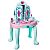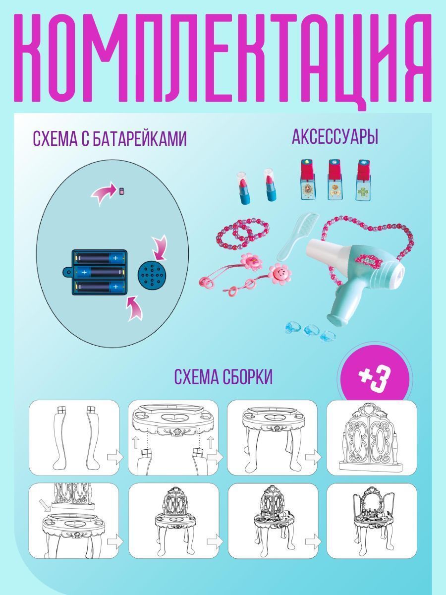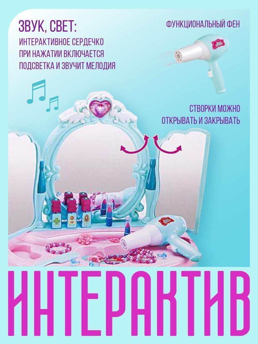 Столик-трюмо косметический из серии Салон красоты «Мое волшебное зеркало» - мечта каждой маленькой модницы. Теперь у каждой девочки будет свой уголок, где она, сидя перед зеркалом, сможет делать макияж и придумывать элегантные, модные прически, совсем как мама! Столик-трюмо выполнен в нежных, бирюзово-розовых цветах, у него 4 элегантные ножки, выдвижной ящик для хранения «косметики» и украшений, изумительное трюмо. Оно состоит из большого круглого зеркала и дополнительных зеркал, размещенных в открывающихся створках. В верхнюю часть центрального зеркала встроено интерактивное сердечко, при нажатии на которое включается подсветка и звучит мелодия. Входящий в состав набора фен можно включить, и он будет дуть. Многочисленные игровые предметы, дополняющие набор, сделают игру девочки интересной и увлекательной.