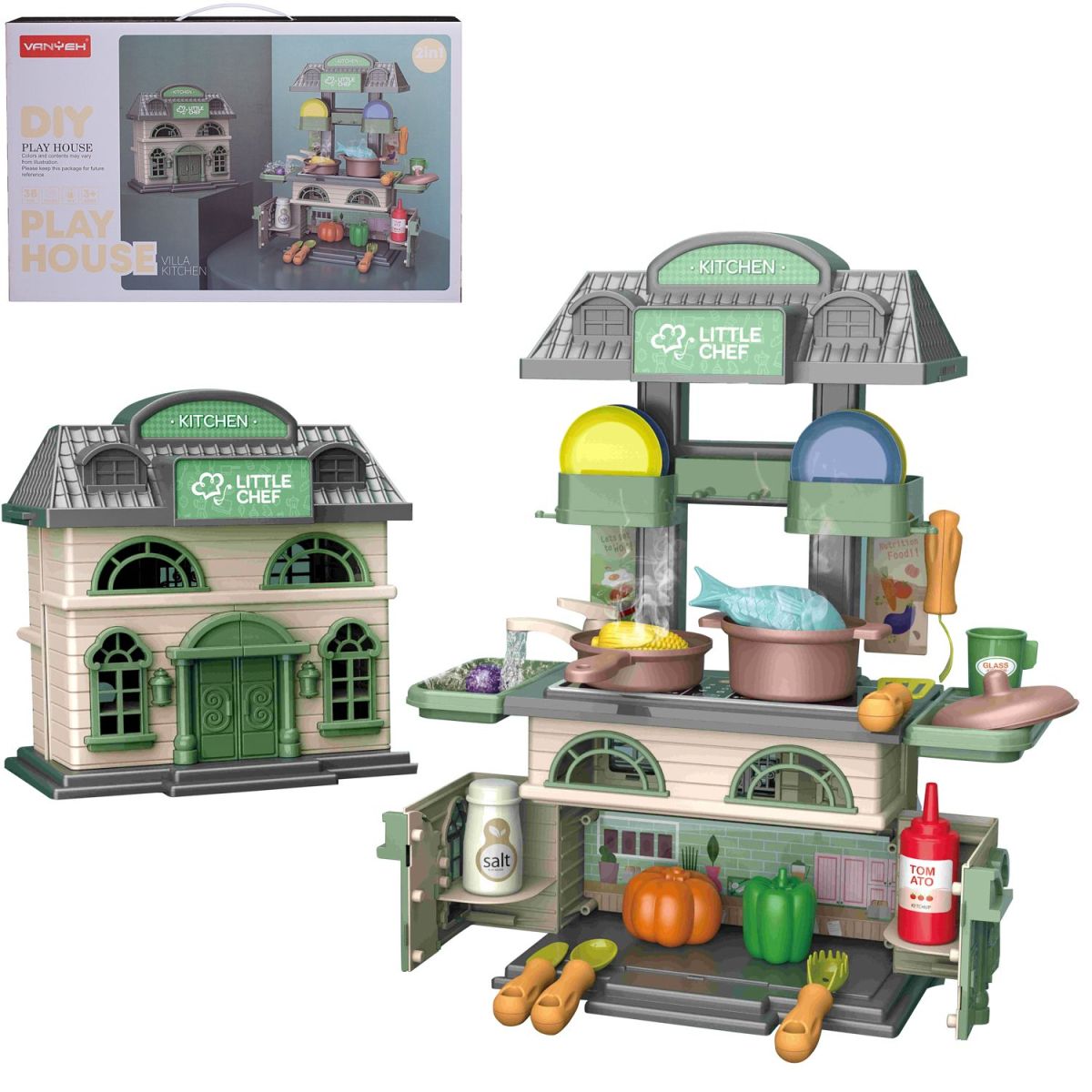 Уникальный игрушечный дом от бренда Junfa — это просто мечта любого ребенка! С помощью дополнительных элементов дом легко преобразуется в двухуровневую кухню юного шеф-повара с многочисленными тематическими предметами для увлекательной игры. После игры все детали набора можно сложить внутри дома, в котором их будет удобно хранить и транспортировать. Набор выполнены из качественного прочного пластика привлекательных цветов, отлично подойдет для сюжетно-ролевых игр ребенка, поможет ему почувствовать себя настоящим поваром на игрушечной кухне.