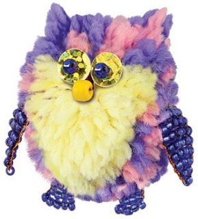 Маленькая пушистая сова с удивлёнными глазками, крылышками, лапками и хвостиком из блестящего бисера – милая игрушка или брелок. Рукодельница старше 8 лет может изготовить его с помощью набора «Маленькая сова»: нужно скрутить помпон из разноцветной пряжи, используя картонные шаблоны, сплести из бисера по схемам лапки, крылья, хвостик и глазки-пайетки с носиком, соединить всё в единую фигурку, – и сова готова.