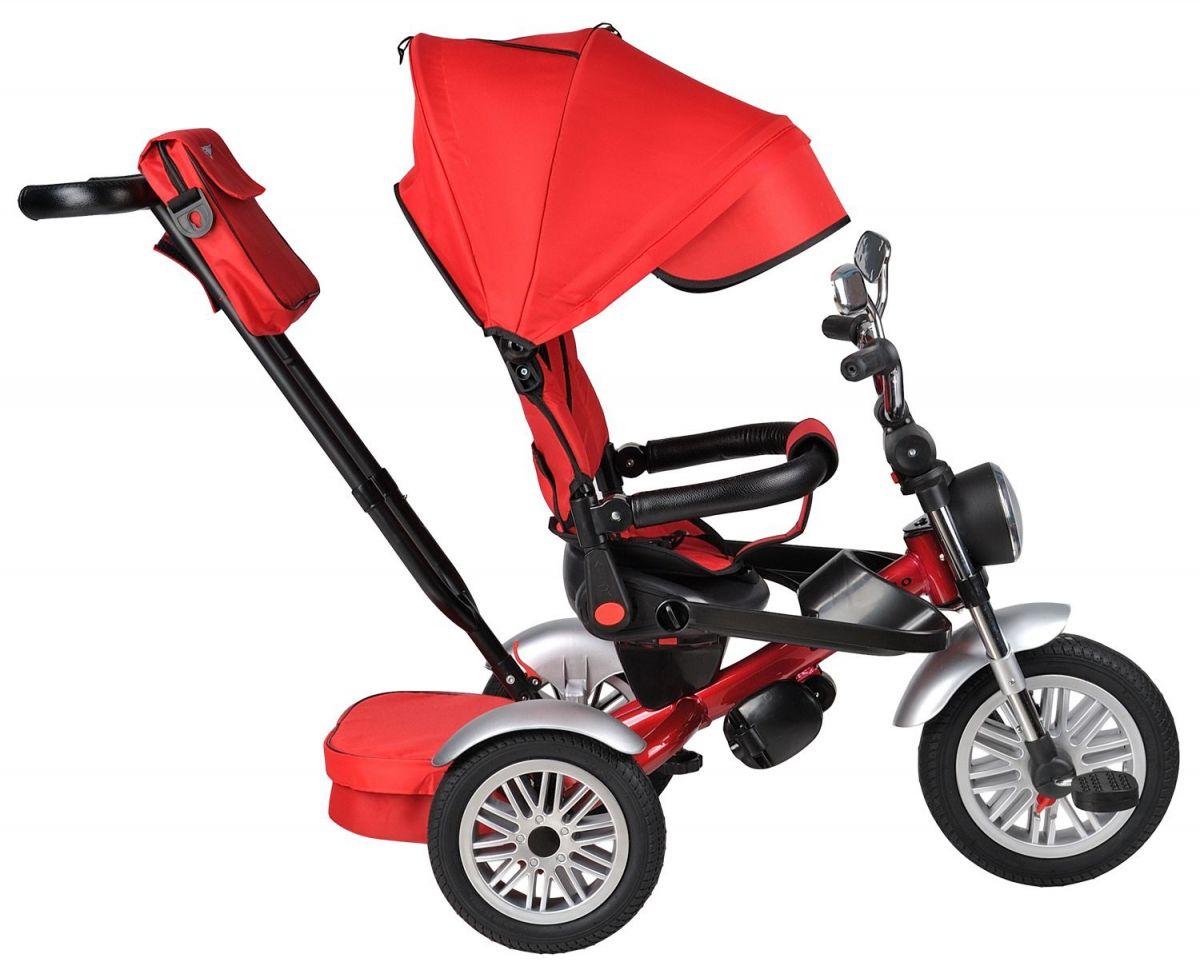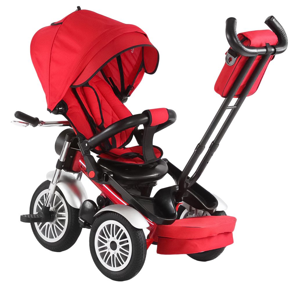Родительская ручка съемная, регулируется по высоте. Сидение в мягком удобном чехле с трехточечным ремнем безопасности.