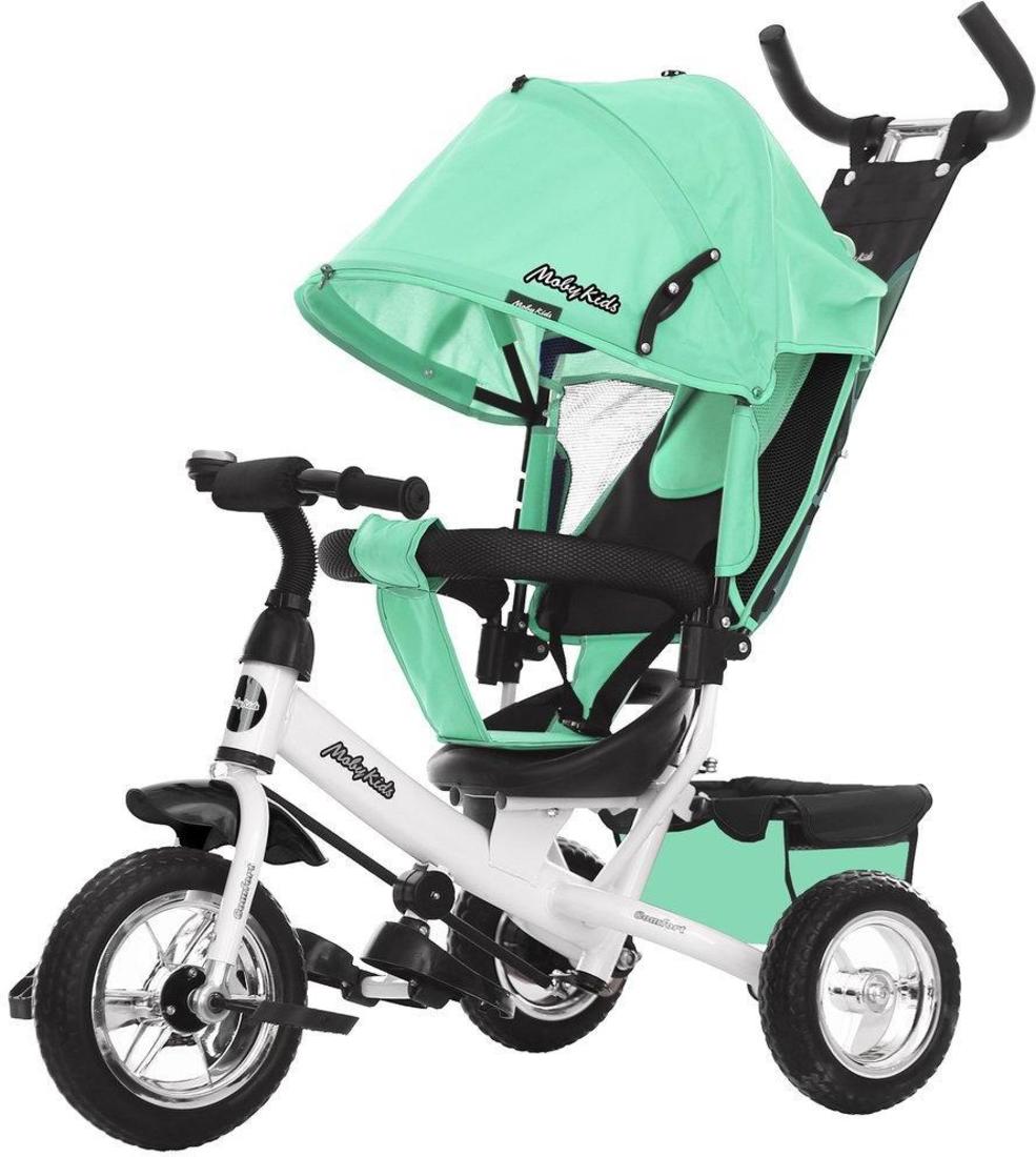 Детский трёхколёсный велосипед Moby Kids Comfort 10х8 EVA. В данной модели предусмотрены дополнительные функции, которые сделают прогулку малыша и его родителей максимально комфортной.  Характеристики: металлическая рама;  колеса из EVA: диаметр переднего колеса - 25 см (10"); диаметр задних колес - 20 см (8");  двойная телескопическая ручка-толкатель с сумочкой фиксируется в двух положениях (выше-ниже); мягкий вкладыш-«кенгуру» на сидении;  сиденье с высокой спинкой фиксируется в трех положениях;  съемный мягкий подголовник; складной тент колясочного типа с фиксаторами положения;  ножной тормоз; съемная раздвижная дуга безопасности с мягкими подлокотниками;  ремень безопасности;  звонок на руле; складные подставки для ног; тканевая багажная корзина на металлическом каркасе.