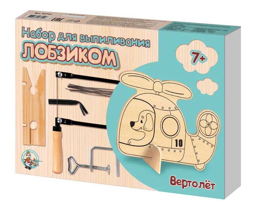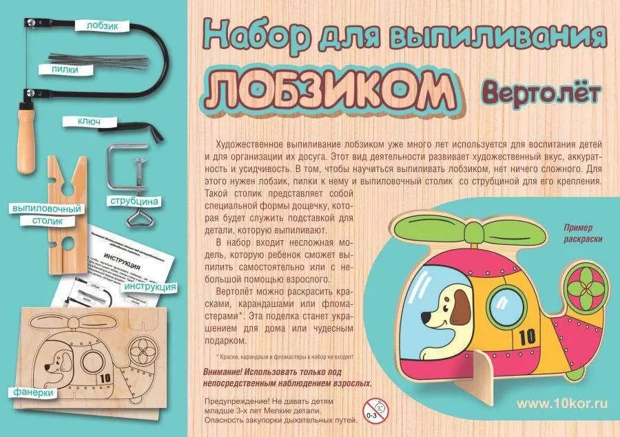 Выпиливание лобзиком развивает у ребенка художественный вкус, аккуратность и усидчивость. В набор входит несложная модель вертолёта, которую ребёнок сможет выпилить самостоятельно, и подробная инструкция.