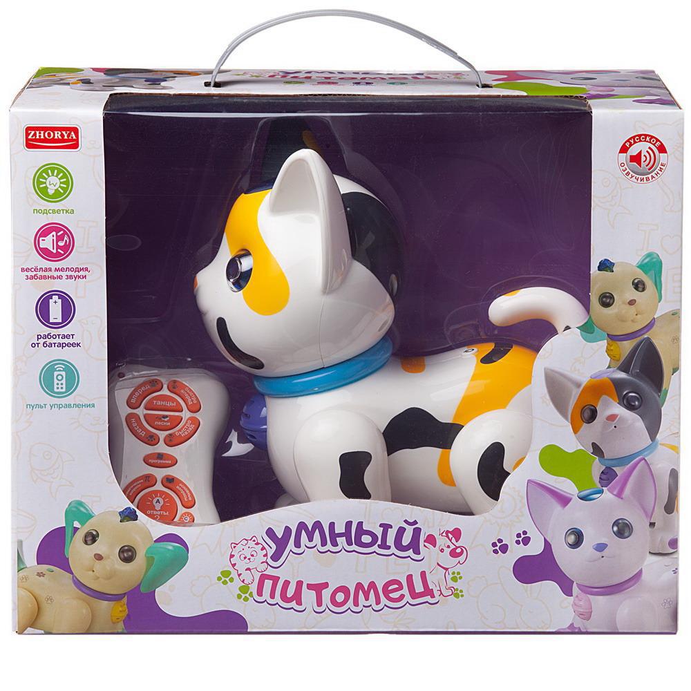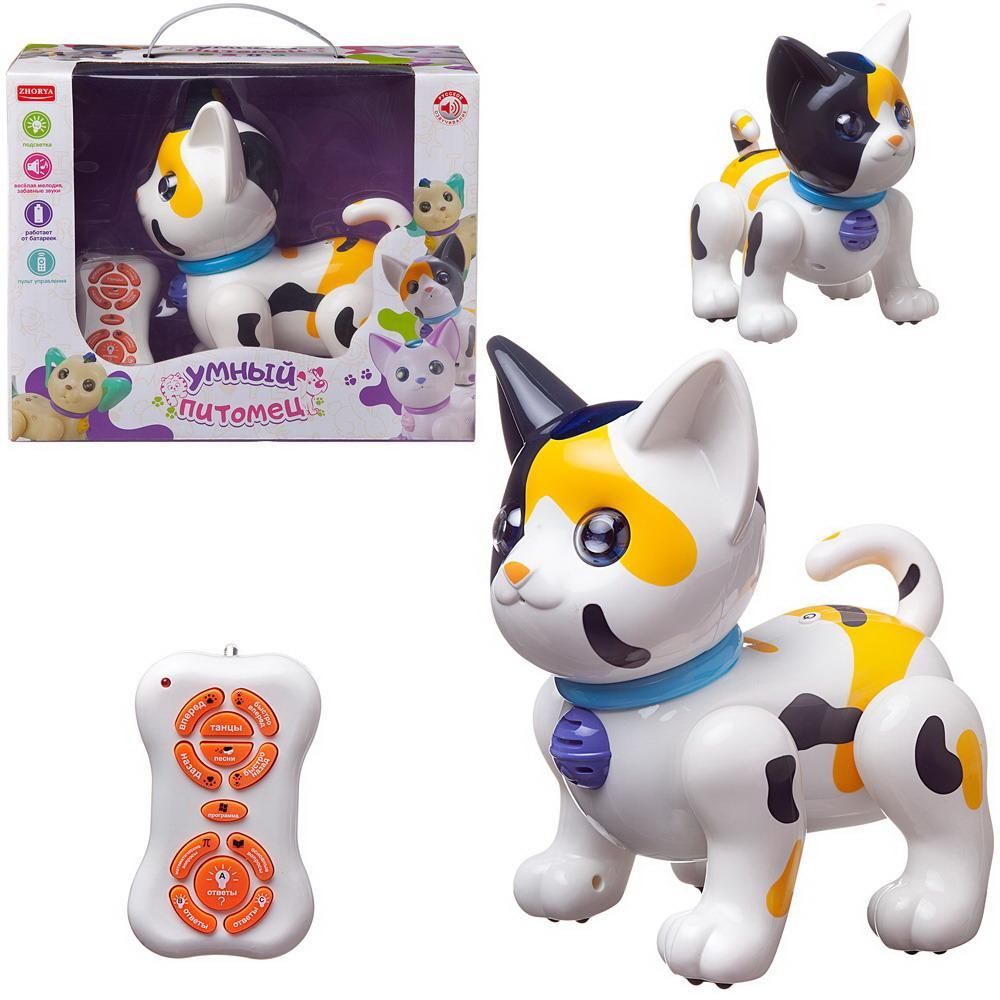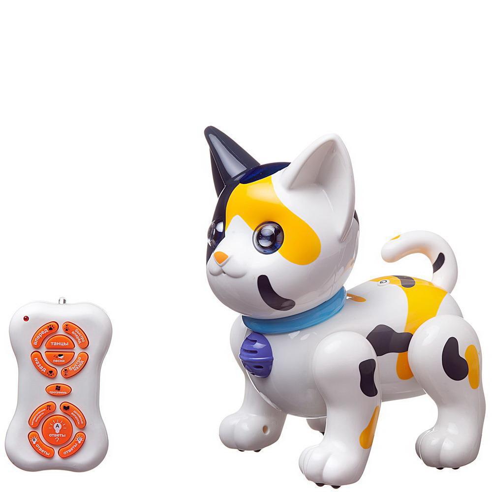 Этот милый пятнистый Котенок станет отличным подарком любому ребенку. Управление Котенком осуществляется с помощью пульта дистанционного управления. Он умеет ходить вперед и назад, при этом забавно шевеля хвостиком и поворачивая голову вправо-влево. Котенок умеет петь (знает 5 песен) и танцевать (знает 3 танца под разные мелодии), имеет множество обучающих режимов, задает разнообразные вопросы.