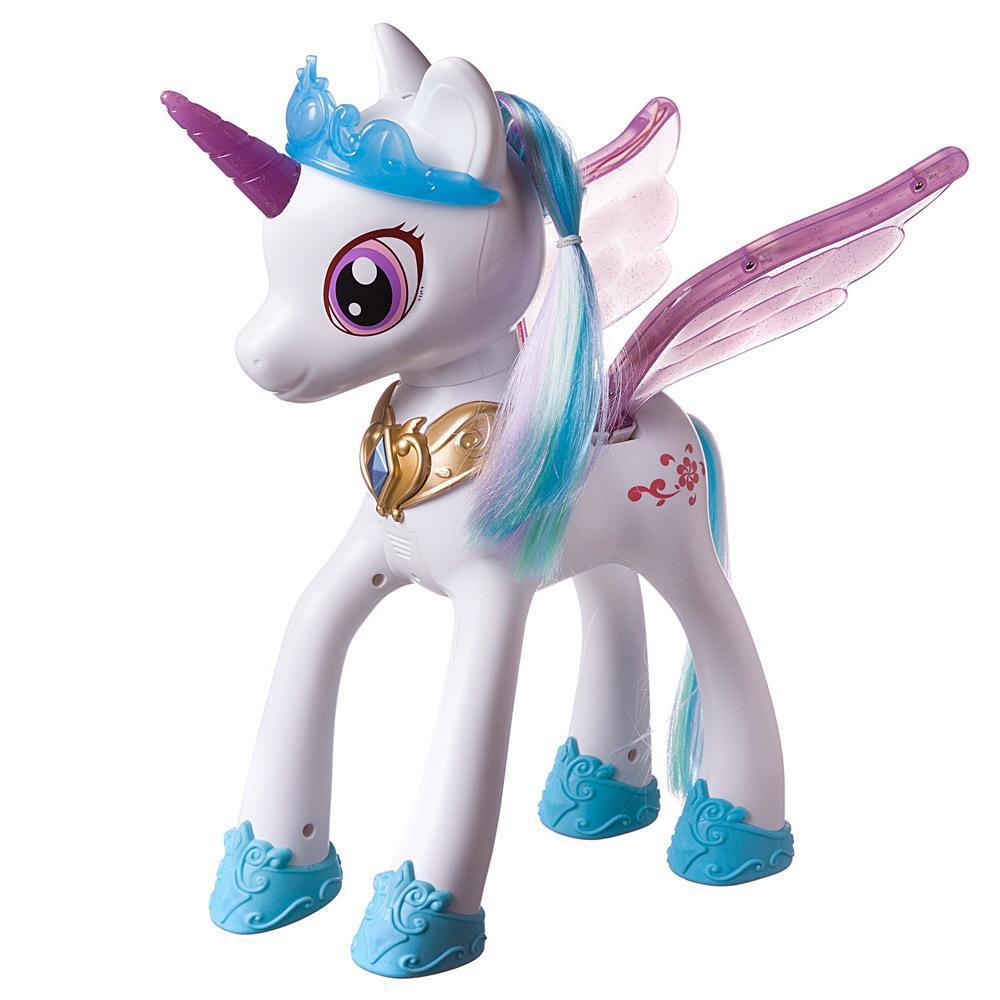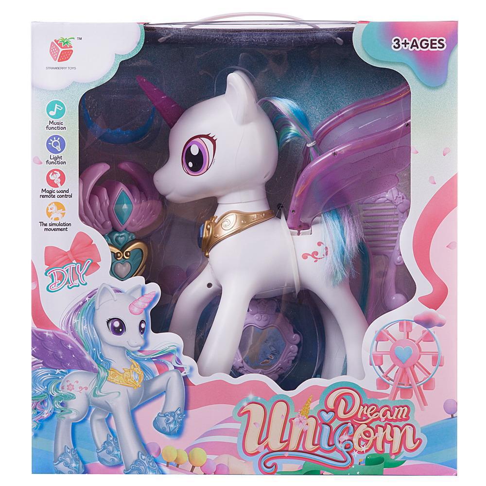 Эта чудесная Лошадка-Единорог покорит сердце любой девочки. Она очень красивая, у нее светящиеся рог и крылышки, огромные глаза. Ее гриву и хвост можно расчесывать и заплетать в косички. Лошадка похожа на сказочную принцессу, на ее голове красуется корона, а на шее золотое ожерелье. Активировать лошадку можно при помощи волшебной палочки или прикосновением руки к узору на ее теле. Она будет приветливо качать головой из стороны в сторону и махать своими роскошными крылышками, которые переливаются разноцветными огоньками. На волшебной палочке можно выбрать и включить 3 волшебные мелодии. В ножки лошадки встроены колесики, с помощью которых ее можно легко катать по полу, использовать как игрушку-каталку. Красивые ботиночки на ее ножках легко снимаются.