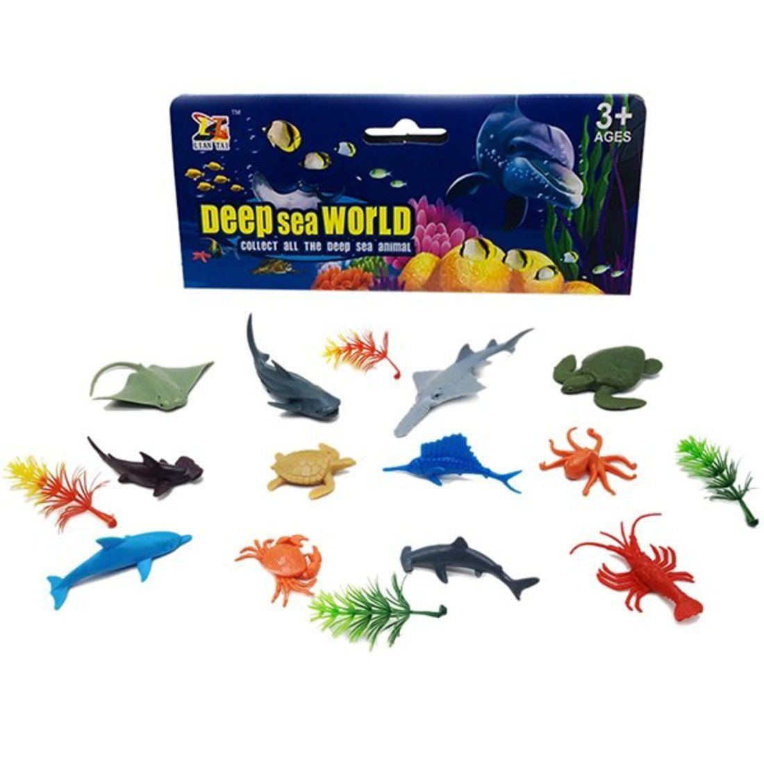 16 предметов (12 фигурок морских животных, 4 игрушечных элемента среды обитания)